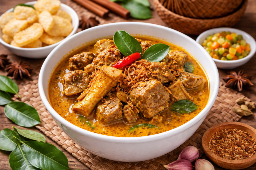 Menariknya, kelapa sangrai berperan penting dalam menciptakan kuah yang lebih kental sekaligus menambah rasa gurih alami.